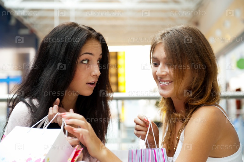 Две подруги с пакетами в руках в торговом центре