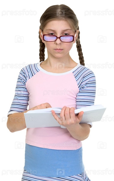 Серьезная школьница с очками и книгой на белом фоне
