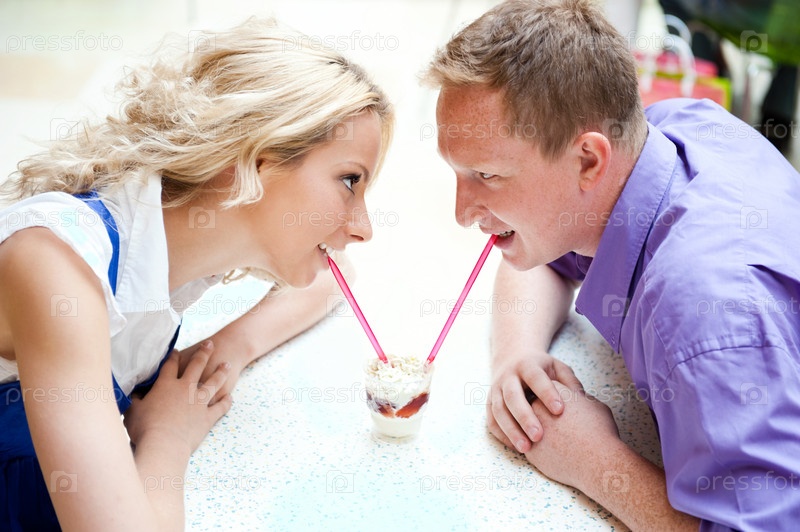 Молодая пара сидит в кафе в торговом центре
