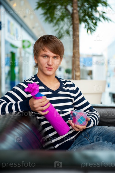 Молодой парень сидит в торговом центре с бутылкой вина и подарком