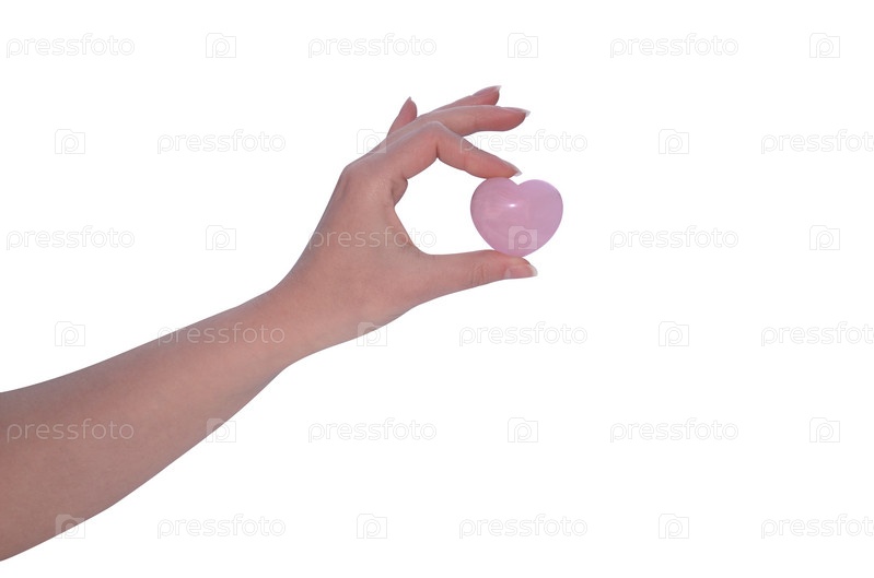 Женская рука держит сердце розовый кварц