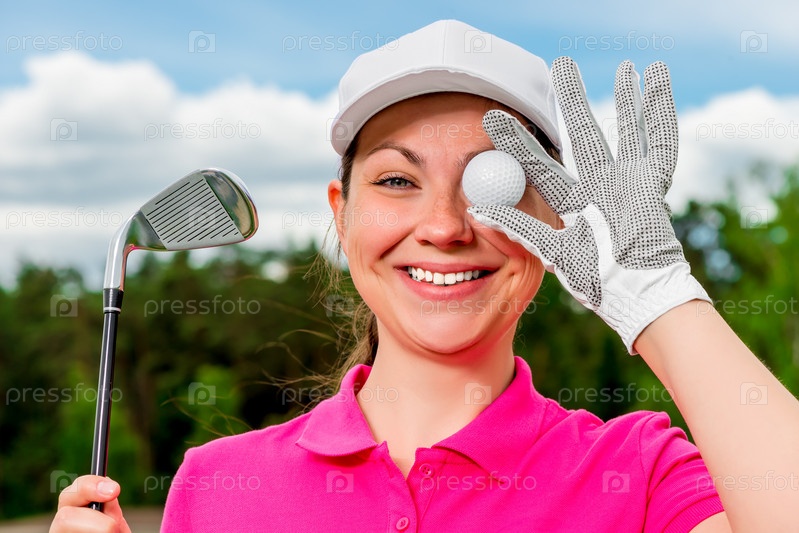 Комический портрет красивая девушка с мячом и клюшки
