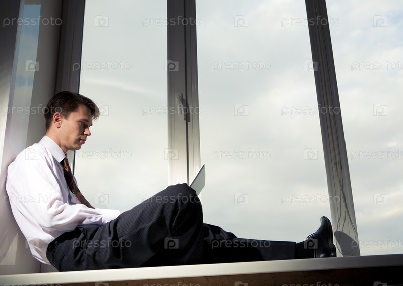 Усталый бизнесмен сидит на подоконнике и смотрит на монитор ноутбука