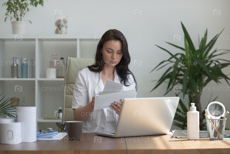 Доктор работает с результаты тестирования и компьютер