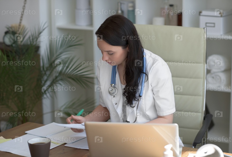 Доктор работает с результаты тестирования и компьютер
