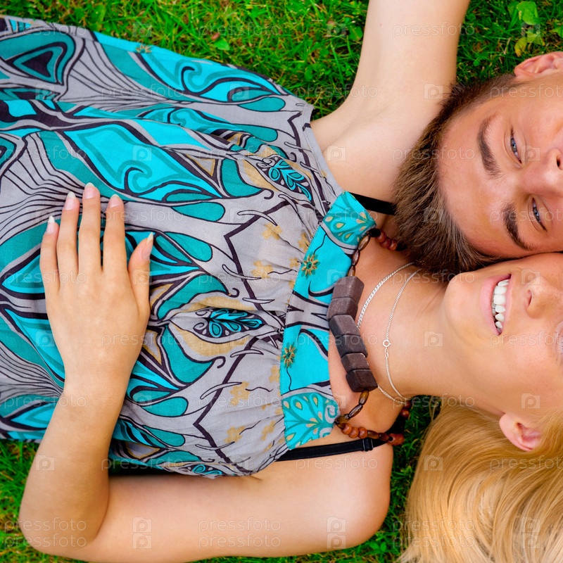 Молодая счастливая пара на траве