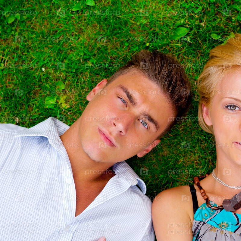 Молодая счастливая пара на траве