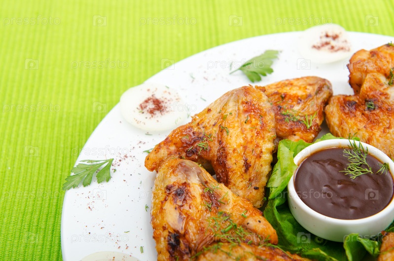 Фрагмент тарелки с жареными куриными крыльями и соусом