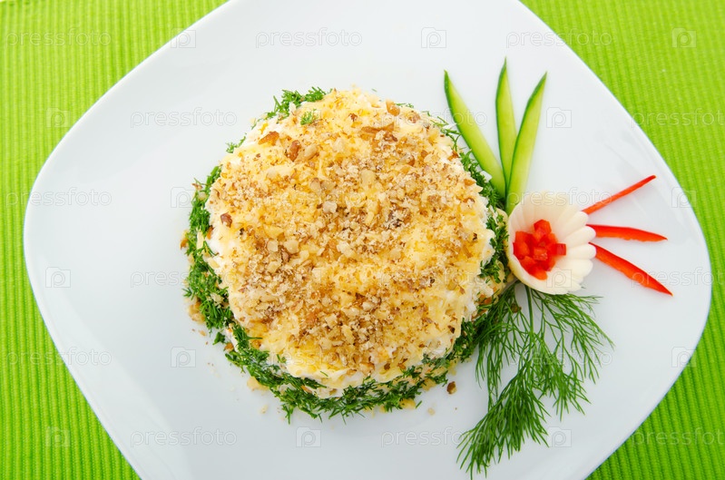 Вкусный рыбный салат на тарелке