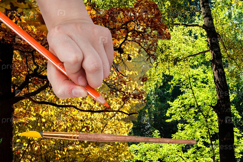 Карандаш рисует осенние листья в лесу зеленый лето