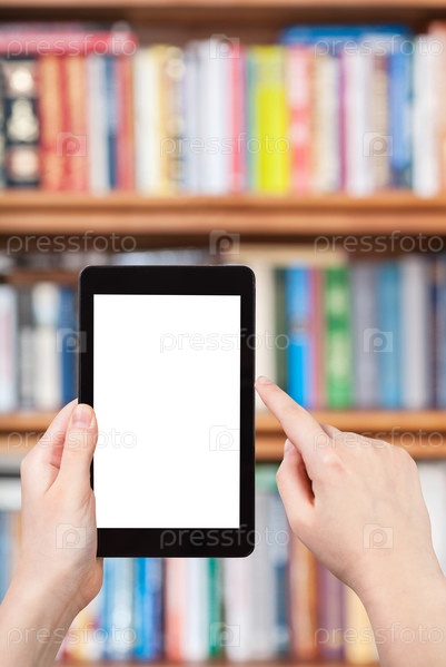 Рука держит планшет на фоне книжный шкаф