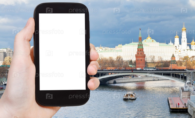 Смартфон и мост у Московского Кремля