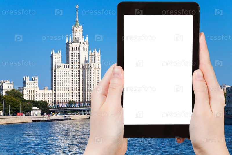Планшет с вырезанным экраном и Москвский небоскреб