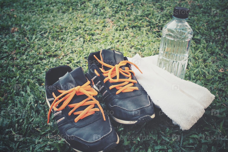 Кроссовки с оранжевыми шнурками и бутылкой воды