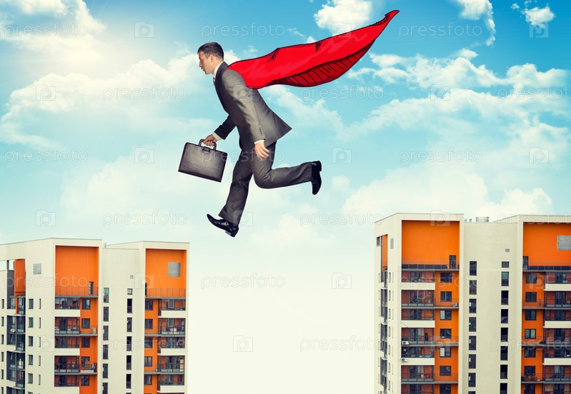 Бизнесмен перепрыгивает через здания