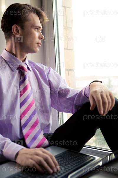 Портрет умного бизнесмена, глядящего из окна с ноутбуком рядом