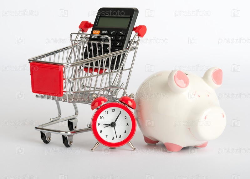 Корзина с калькулятором, копилка и будильник