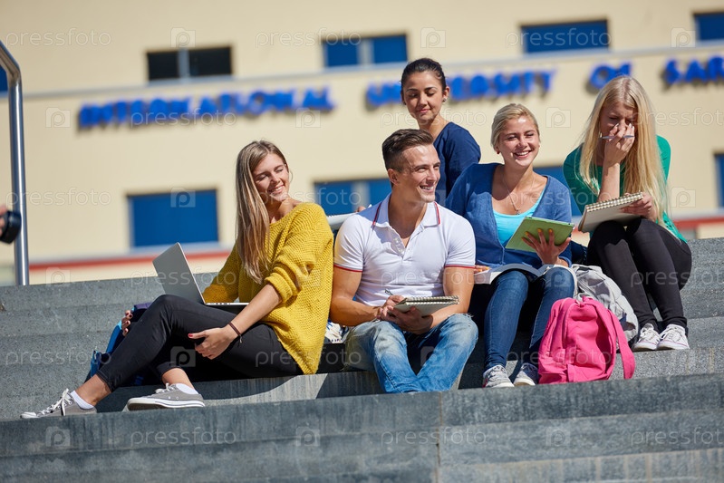 Студенты за пределами сидя на шагах