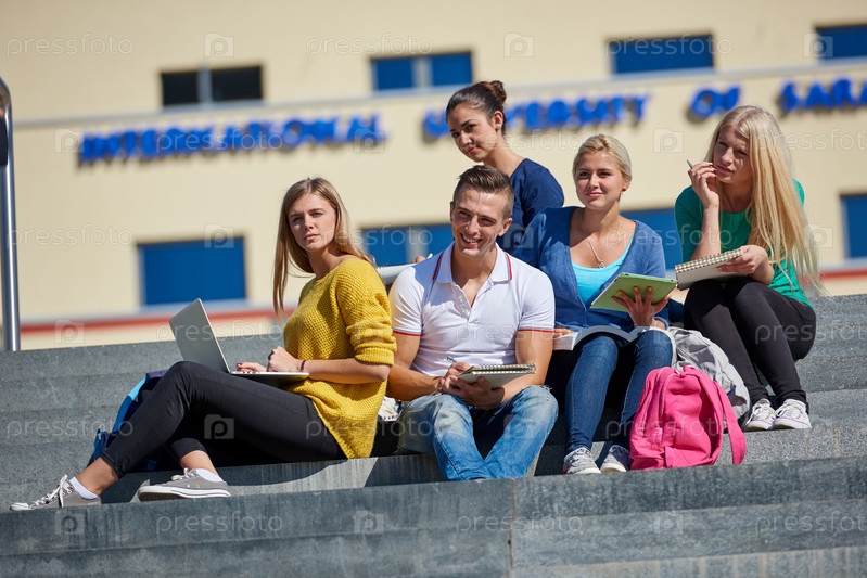 Студенты за пределами сидя на шагах