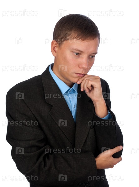 Человек в костюме думает о... изолированный на белом