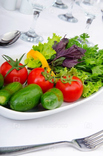 Огурцы, помидоры и зелень на тарелке