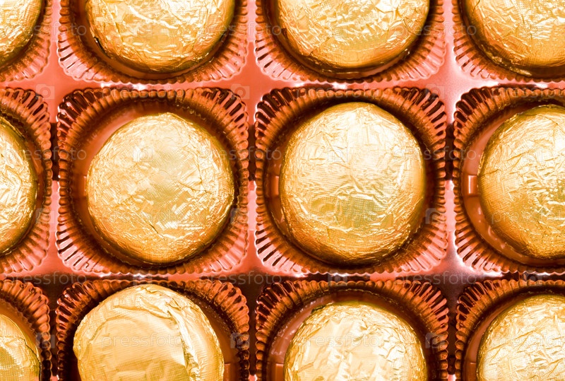 Упакованные в фольгу конфет, лежа в коробке