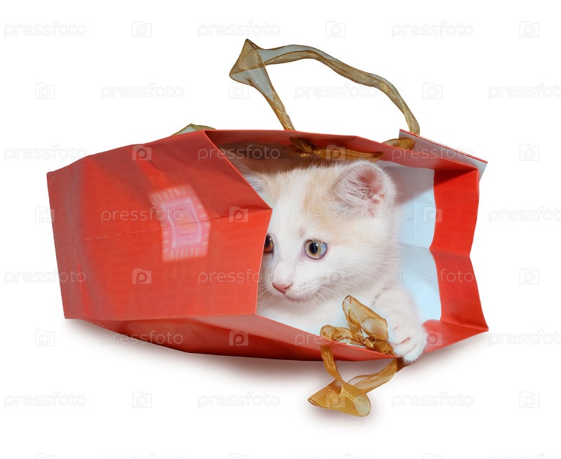 Забавный котенок в красном пакете на белом фоне