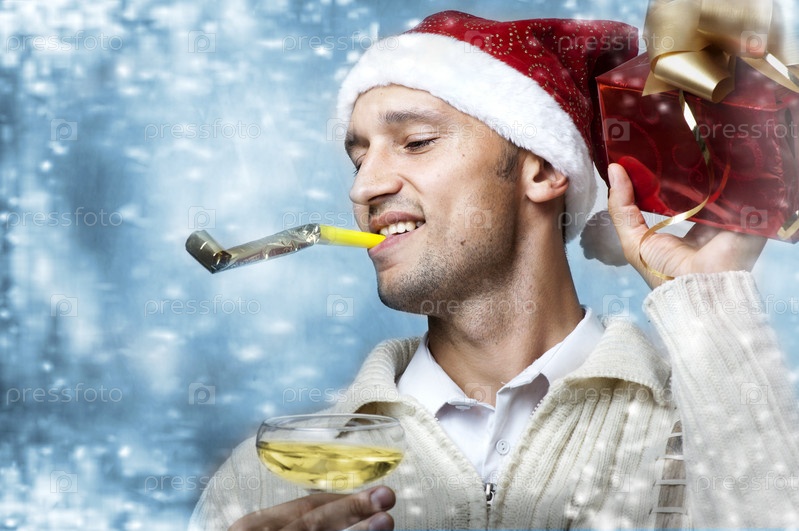 Портрет стильного молодого человека в новогодней шапке с подарком и бокалом вина