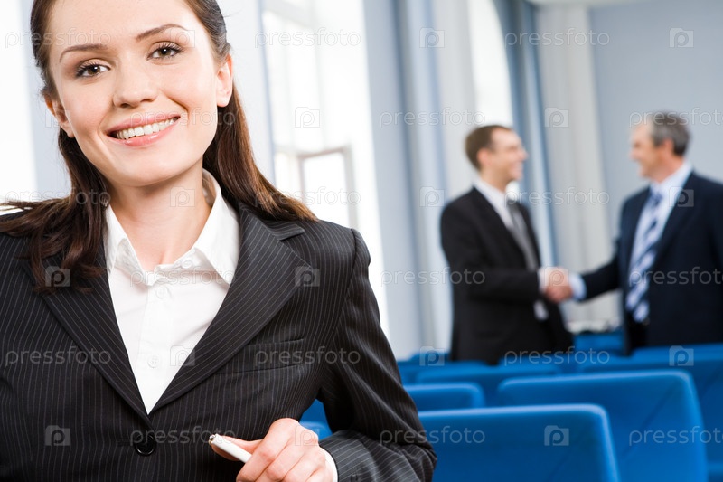 Девушка в деловом костюме улыбается на фоне коллег в конференц-зале