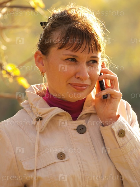 Молодая симпатичная женщина разговаривает по телефону в осеннем парке