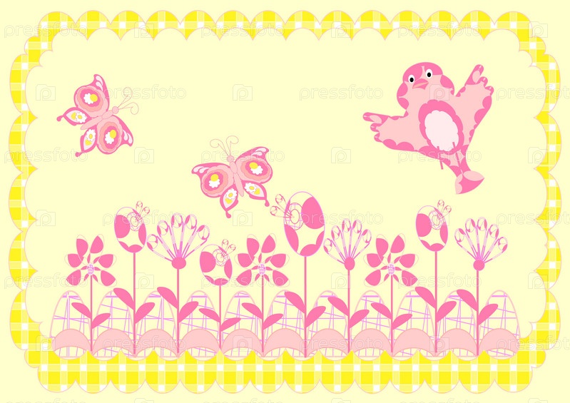 Открытка с цветами, бабочками и птицей