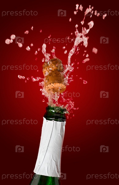 Бутылка шампанского выстреливает пробкой, на красном фоне