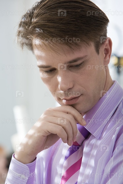 Изображение грустного бизнесмена, который касается его лица и думает