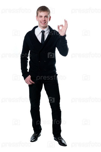 Молодой деловой мужчина с жестом "ОК", изолированный на белом фоне