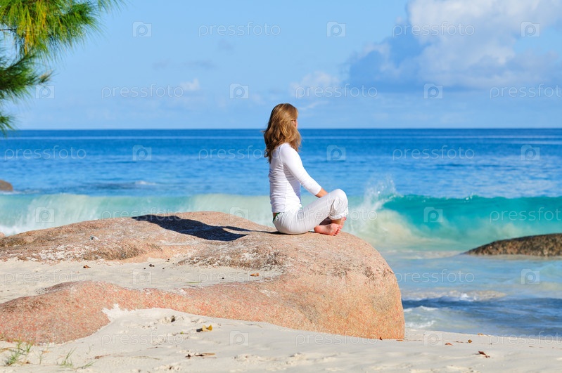 Девушка медитирует на берегу океана