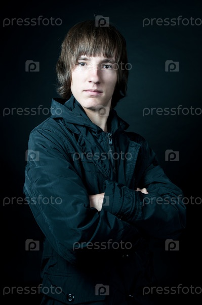 Портрет юноши в черной ветровке на черном фоне