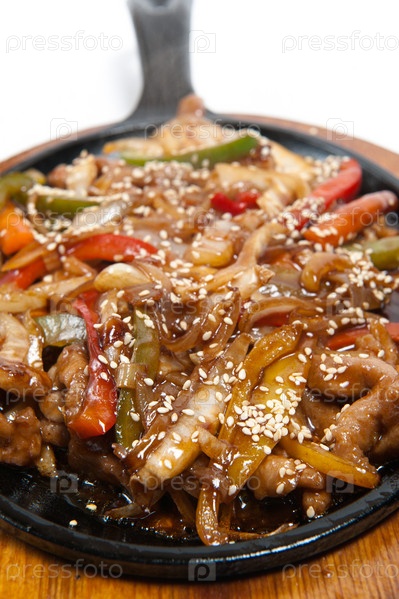 Жареное мясо с овощами на сковороде на белом фоне