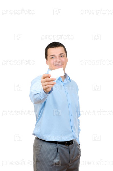 Бизнесмен держит пустую карточку, изолированную на белом фоне