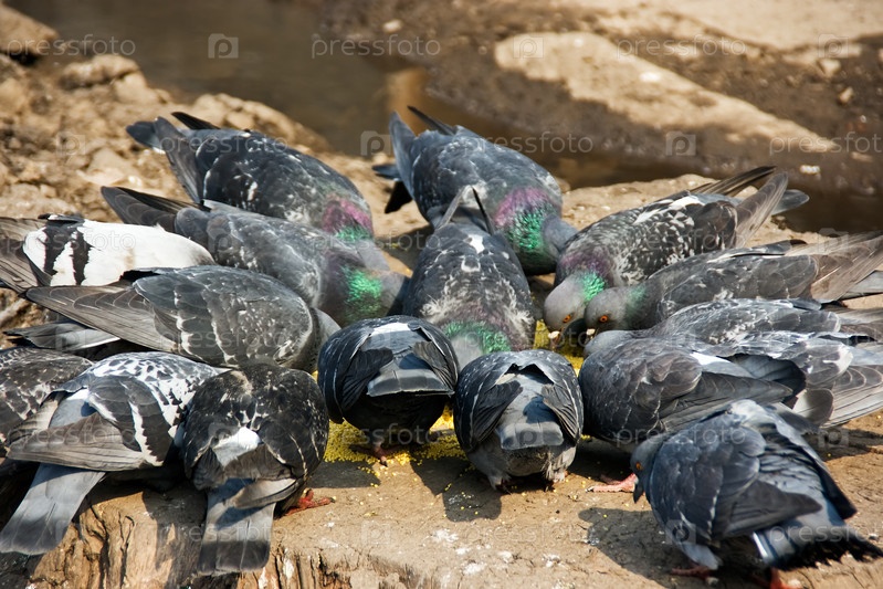 Голуби едят ячмень на тротуаре