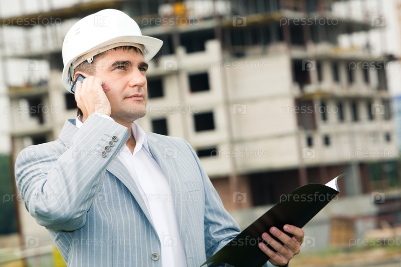 Портрет рабочего, разговаривающего по телефону на стройке
