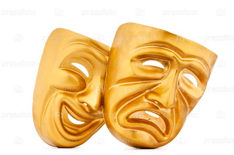 Золотые театральные маски на белом фоне