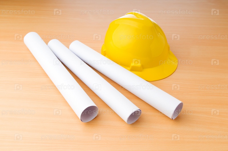Чертежи и каска на столе