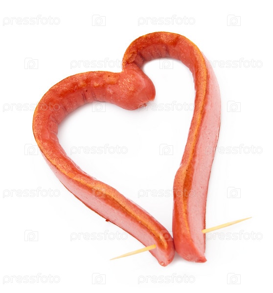 Жаренная колбаса в форме сердца на белом фоне