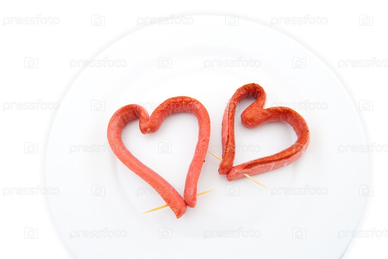 Жаренная колбаса в форме сердца на белом фоне