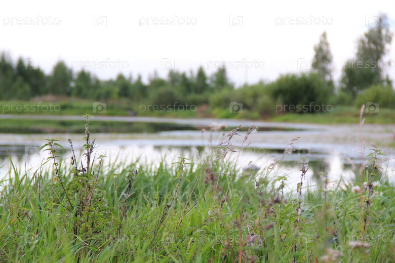 Зеленая трава на берегу пруда
