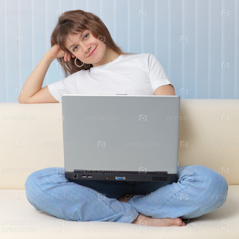 Девушка с ноутбуком отдыхает на диване