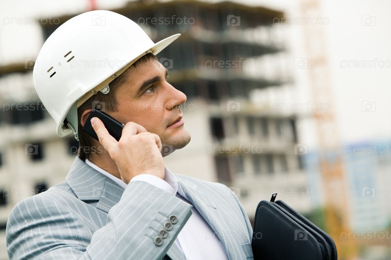 Фото уверенного подрядчика, носящего шлем с мобильным телефоном, смотрящим вверх