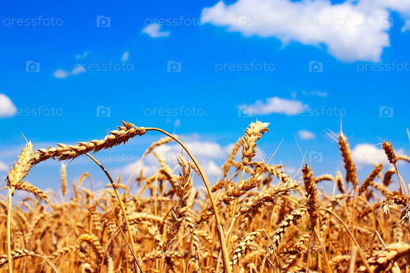 Золотые колосья спелой пшеницы на поле на фоне неба