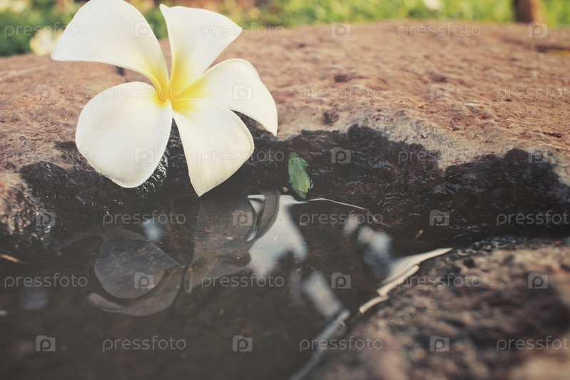 Цветок белой Франгипани с тенью на воде