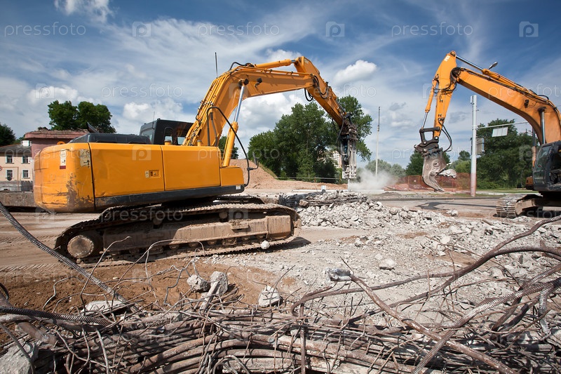 Тяжелый измельчитель и гидромолот разрушают железобетонные конструкции. Индустриальный пейзаж.
